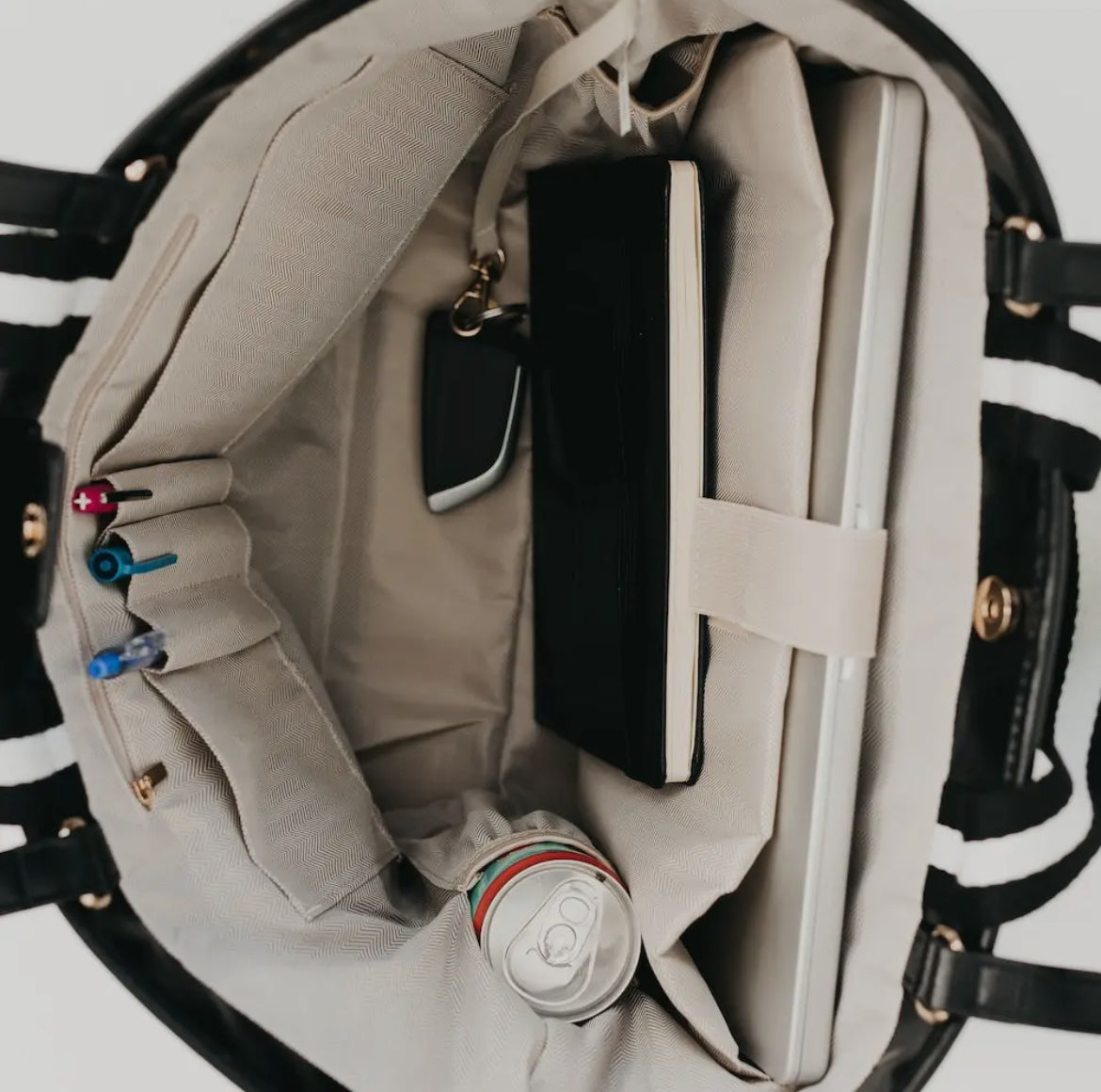An absolute must-have tote for everyday use or travel! Made from a woven vegan leather. Inside you will find features like 2 side water bottle pockets, a zipper pocket, 2 large open pockets + 3 smaller open pockets, a laptop sleeve, and a key leash. Never lose that fob again!